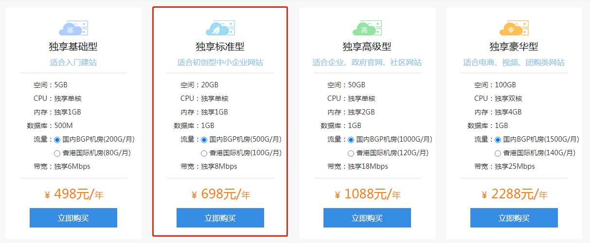 起步阶段建议用虚拟主机,待流量稳定增加后再迁移到云服务器,虚拟主机推荐20G空间左右,价格:700元,可通过网程互联(http://idc.phpwc.cn/  )等IDC服务商购买。